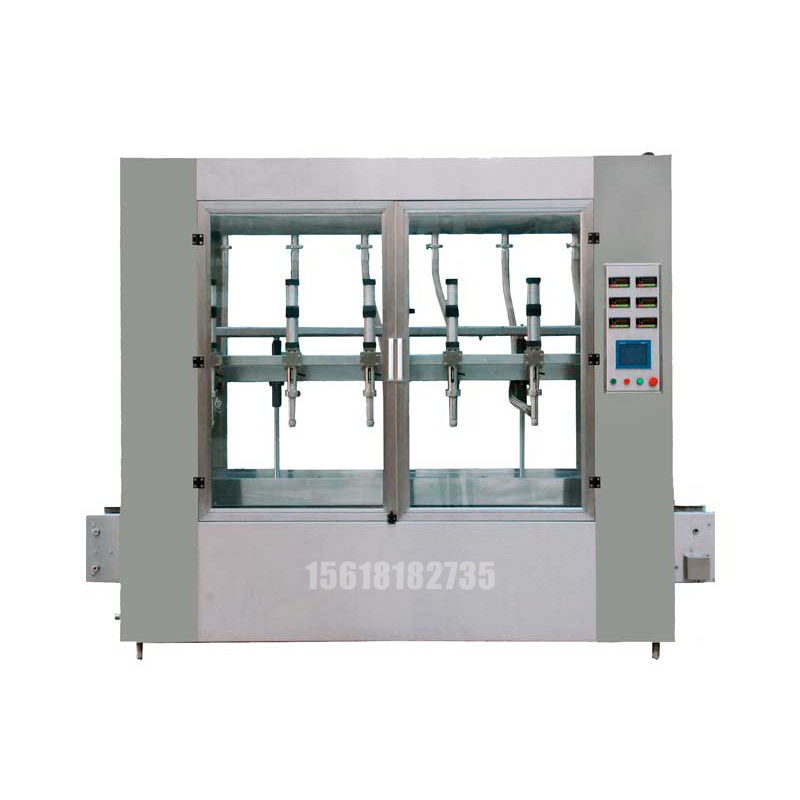 該設備由直線排列的秤臺(帶輥道),鏈條推桿進出瓶機構,快、慢灌裝(帶氣缸下潛)機構,進料過渡料箱,稱重控制儀表及可編程控制單元組成。該液體灌裝秤可以滿足多種液體自動灌裝的需要,采用電機驅動下潛結構,可滿足無泡沫、有泡沫液體的灌裝。